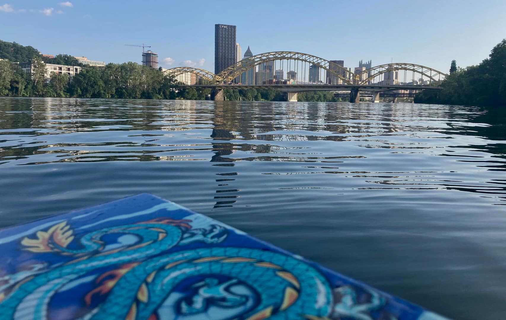 Dragon boat racing is a team sport that involves paddling long, narrow boats with decorative dragon heads and tails. The sport originated in China over 2,000 years ago and is now one of the world’s fastest growing water sports. Crews typically have up to 20 paddlers, a drummer, and a steers person. Paddlers sit in pairs and use single-bladed paddles. The team paddles in sync, as one. The views of the Pittsburgh skyline are a gorgeous backdrop to our dragon boat workouts.